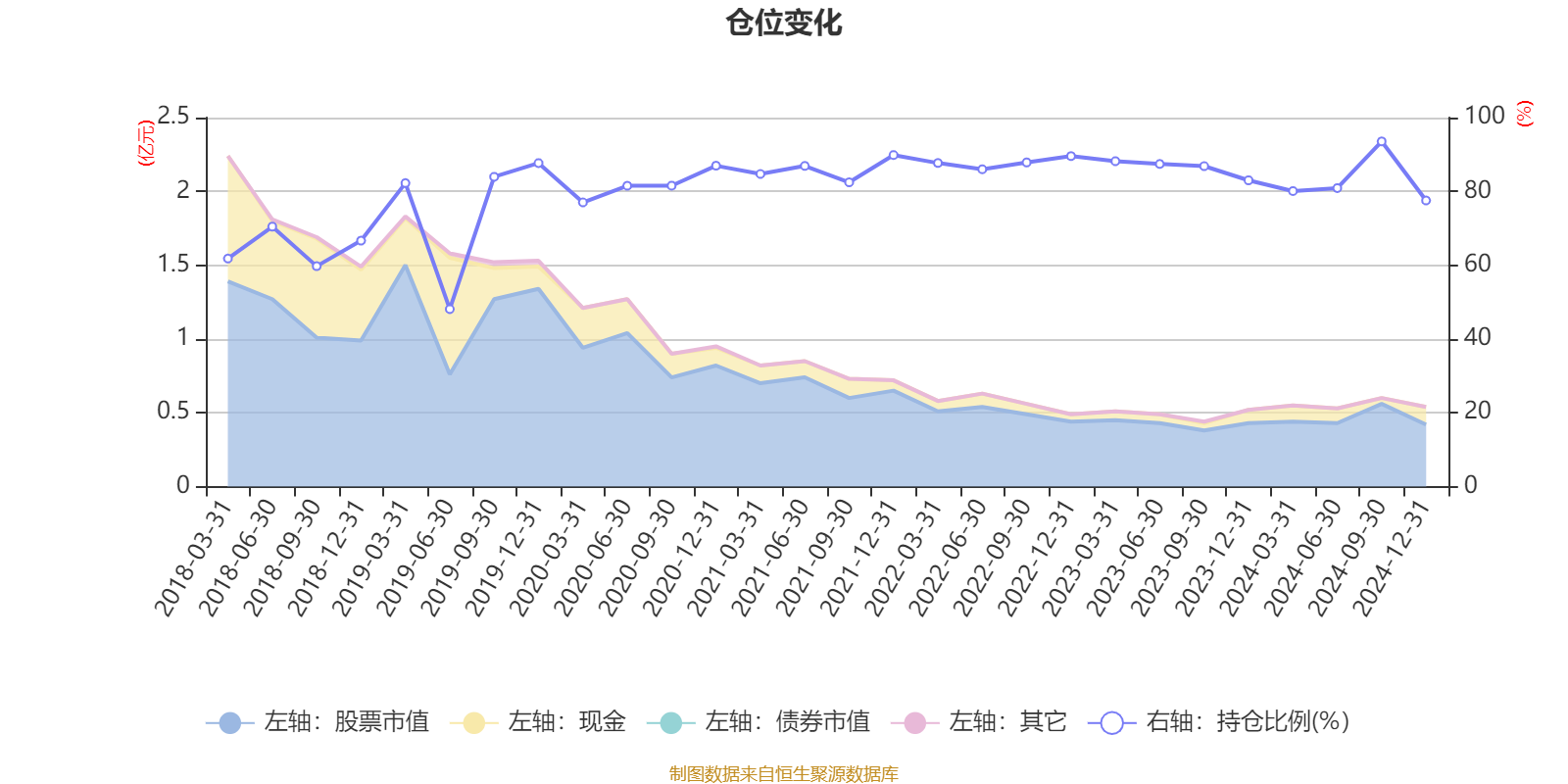 据定期报告数据统计,近三年平均股票仓位为85.72%,同类平均为79.89%。2024年三季度末基金达到93.54%的最高仓位,2019年上半年末最低,为48.09%。