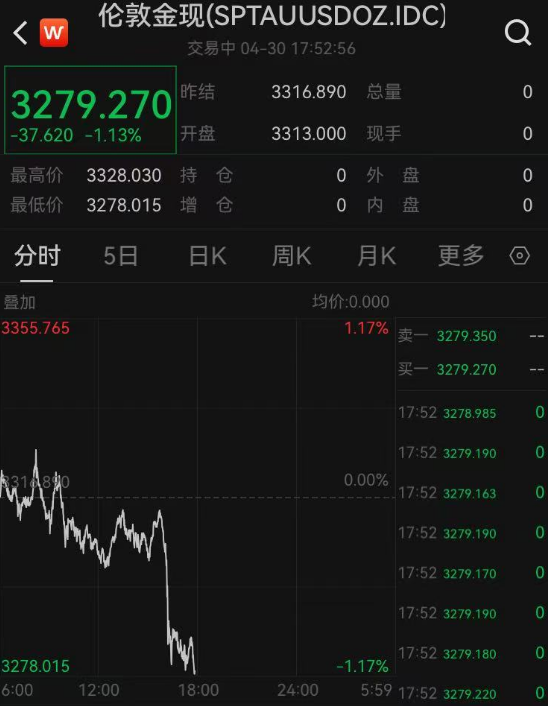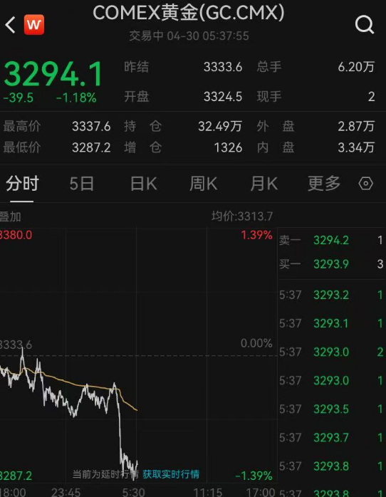 北京时间4月30日晚,黄金价格大跳水,截至发稿,现货黄金跌破3280美元/盎司关口,最新报3279.27美元/盎司,日内跌1.13%;COMEX黄金期货主力最新报3294.1美元/盎司,日内跌1.18%。