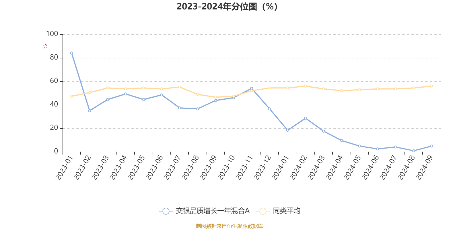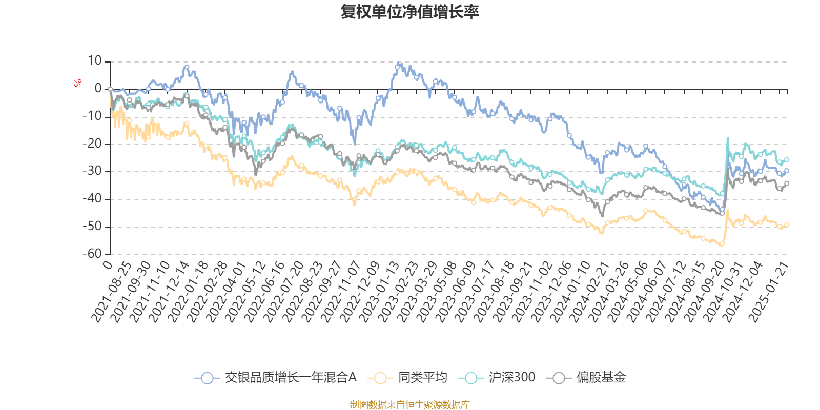 截至1月21日,交银品质增长一年混合A近三个月复权单位净值增长率为0.95%,位于同类可比基金36/139;近半年复权单位净值增长率为7.69%,位于同类可比基金44/139;近一年复权单位净值增长率为-6.31%,位于同类可比基金114/137;近三年复权单位净值增长率为-29.61%,位于同类可比基金59/117。